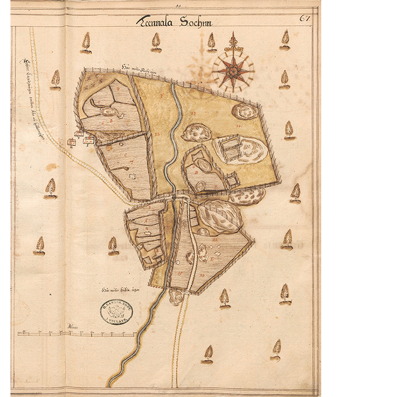 Yksityiskohta maakirjakartasta 1600-luvun lopulta Tenholan Svenskbystä. Suuri rantatie Turusta kohti Helsinkiä kulkee kuvassa kylän halki.