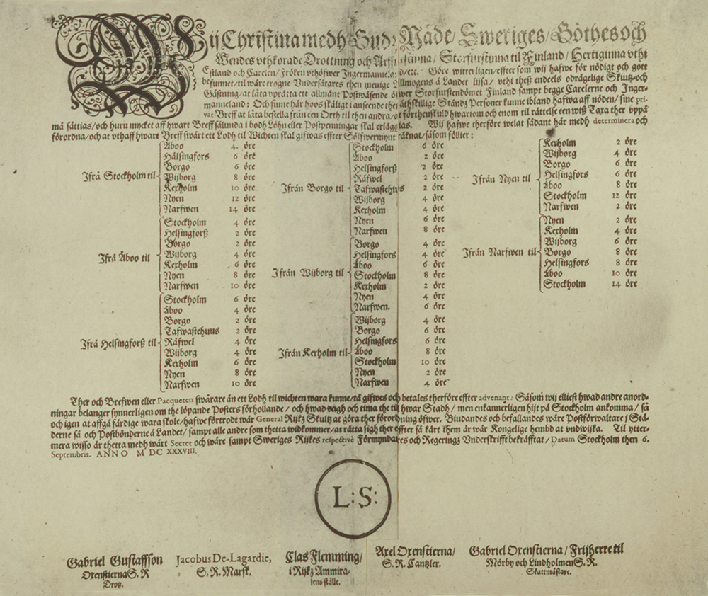 Tukholmasta itään suuntautuvan postireitin ensimmäinen postitaksa eli hinnasto vahvistettiin 6.9.1638.