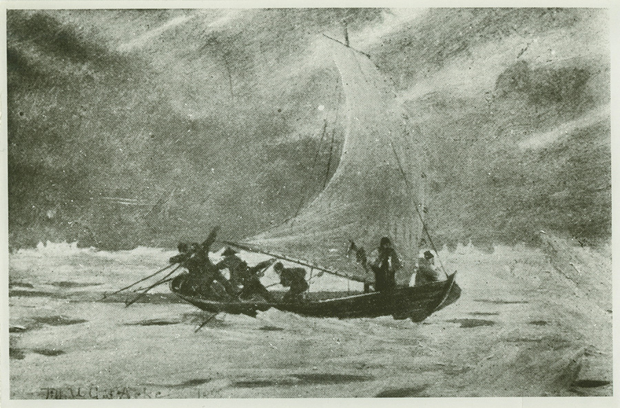 Postivene jäisellä Ahvenanmerellä. Purjeista huolimatta venettä jouduttiin välillä myös työntämään jäätä pitkin.