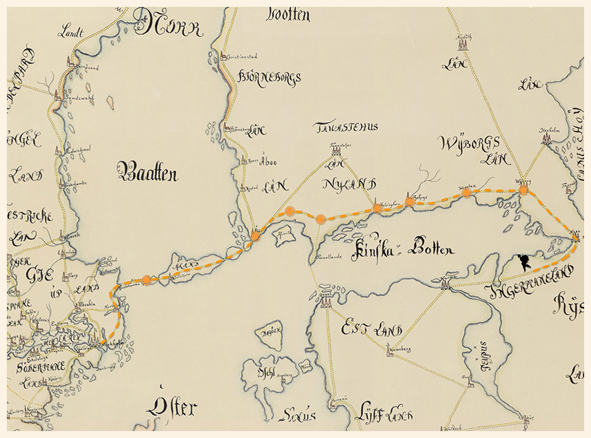 Ensimmäinen itään suuntautuva postireitti kulki Tukholmasta Ahvenanmeren kautta Turkuun ja siitä eteenpäin etelärannikkoa pitkin kohti poliittisesti tärkeää Narvaa. Suomeen suunniteltujen postilinjojen päätekohta oli Baltia. Postireitti oli ainutlaatuinen, sillä maareittien lisäksi se kulki 53 km pituisen merimatkan Ahvenanmeren yli.
