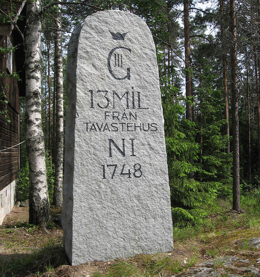 Kopio Ruotsin vallan aikaisesta Laukaan tien varren kivisestä peninkulmapylväästä. Kivisiä patsaita edelsivät puupylväät. Vuosiluku 1748 viittaa tien perustamisajankohtaan.