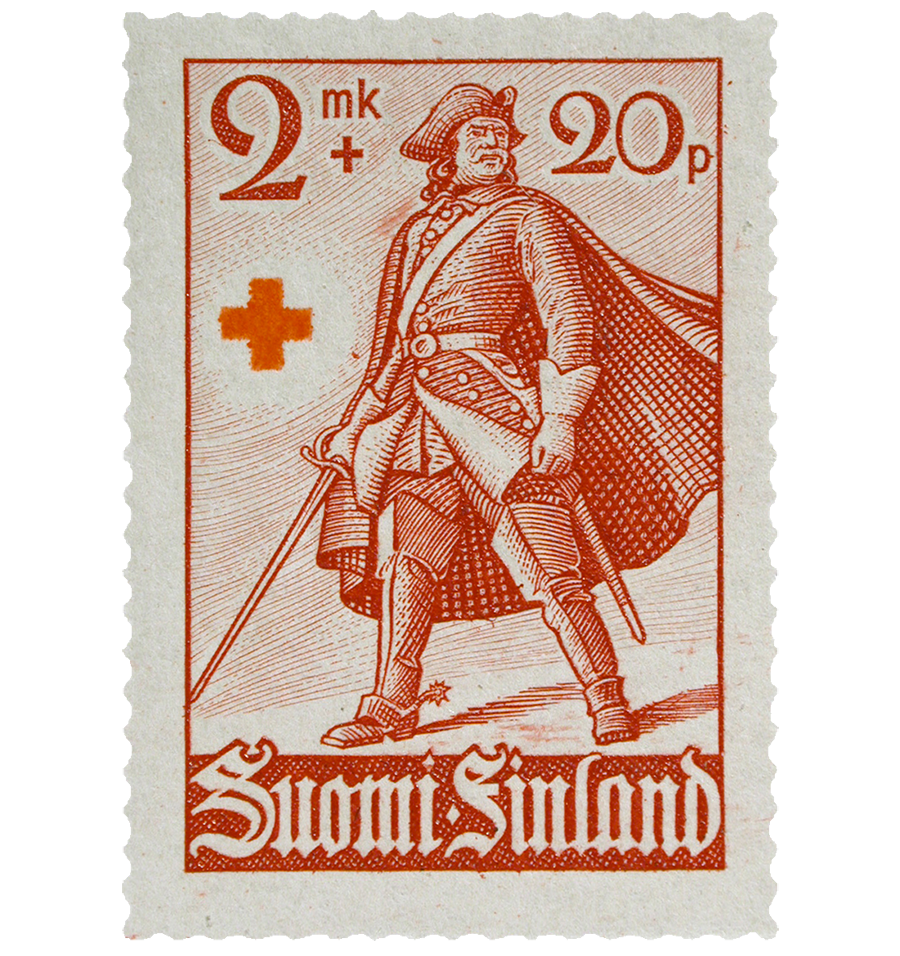 Ruotsin armeijan karoliinisotilas asussaan. Postimerkin suunnitteli Signe Hammarsten Jansson vuonna 1940.