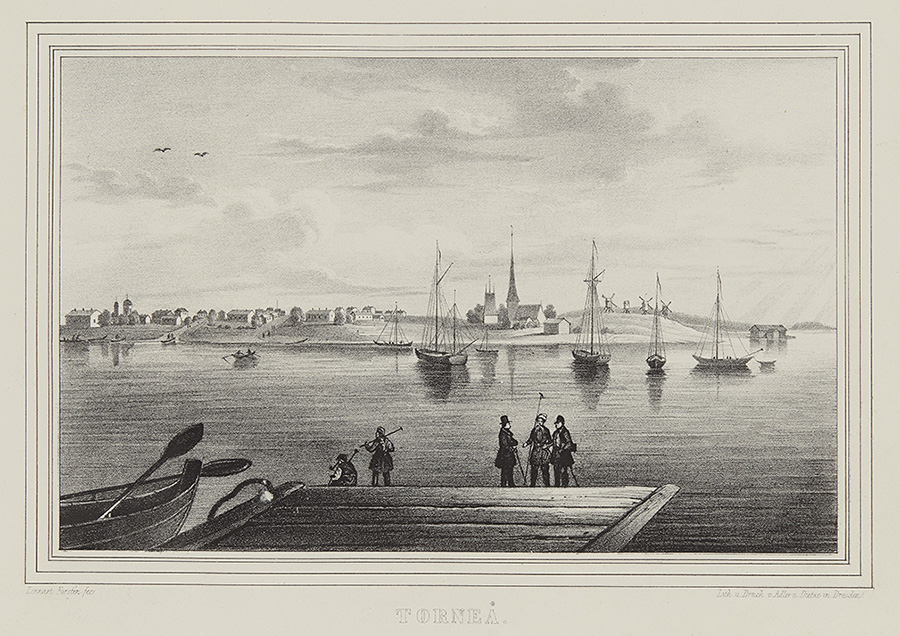 Kaupankäynti Pohjanlahden yli kävi laivoilla, joilla Suomen alueelta vietiin Ruotsiin muun muassa tervaa. Piirustus esittää Torniota 1840-luvulta.
