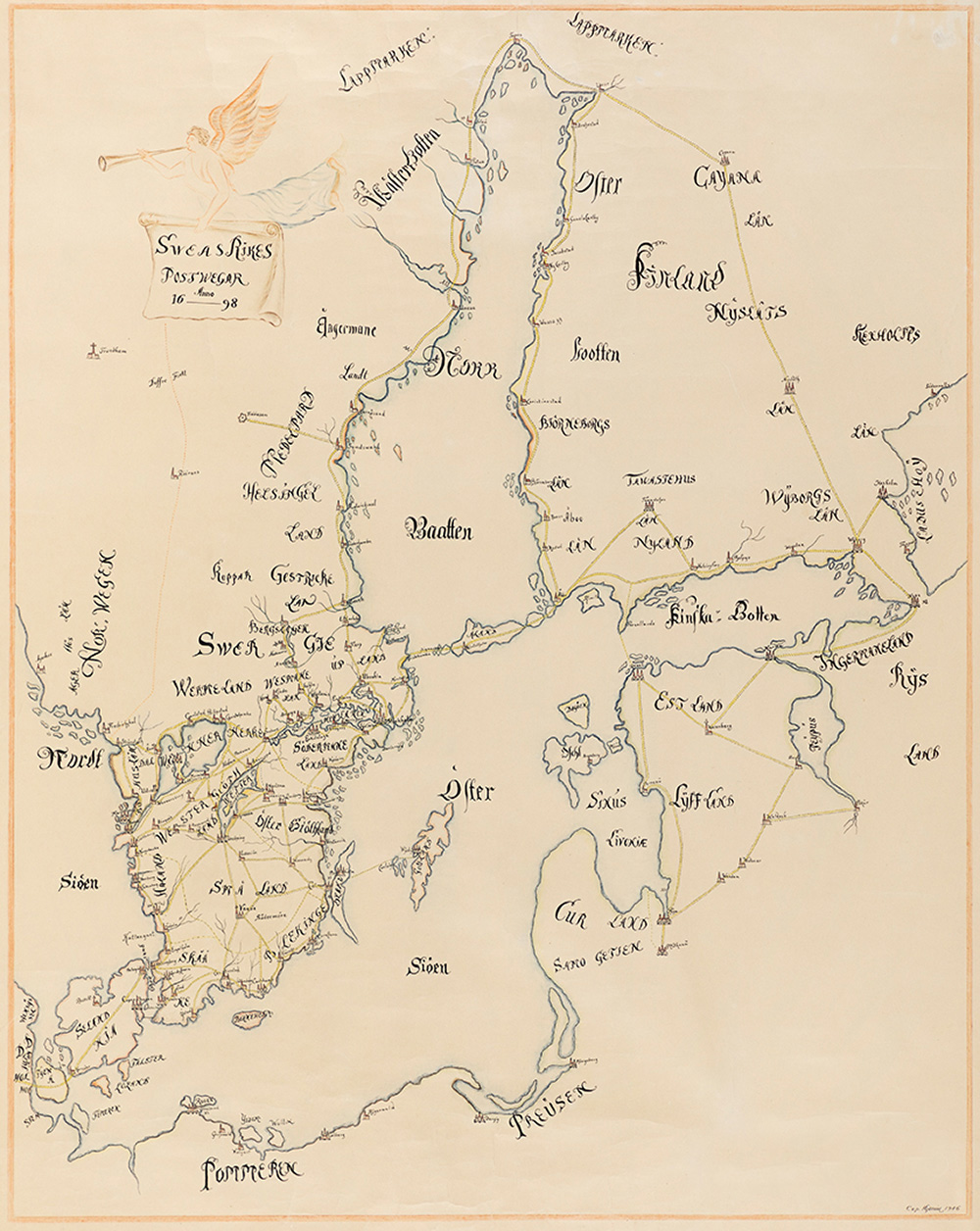 Väritetty fotostaattikopio, Postimuseo. Alkuperäinen kartta: ENIGMA – Museum for post, tele og kommunikation.