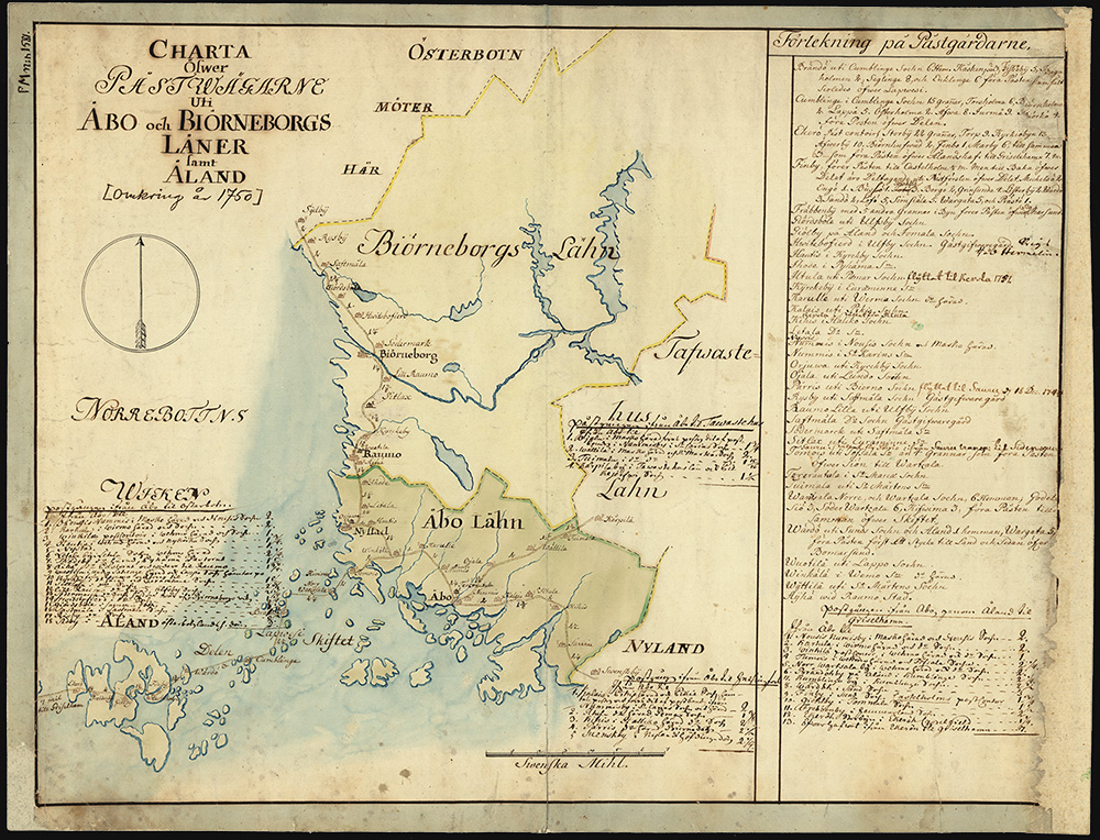 Turun ja Porin läänien ja Ahvenanmaan postikartta noin vuodelta 1750.